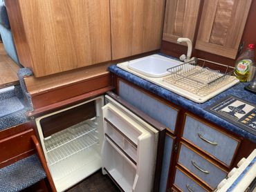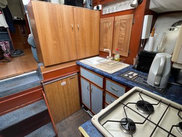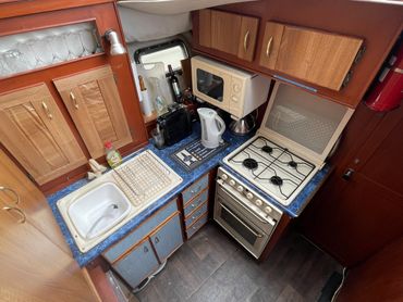 Well equipped galley with fridge, oven, 4 ring gas hob, wash basin and ample storage.